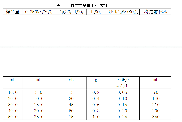 7.9 在特殊情況下,需要測定的試料在10.0mL到50.0mL之間,試劑的體積或重量按表1作相應的調整。