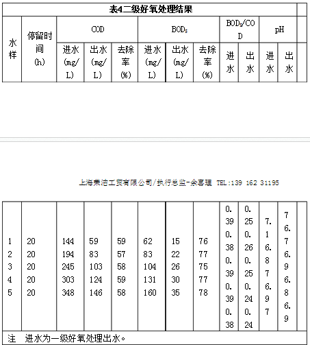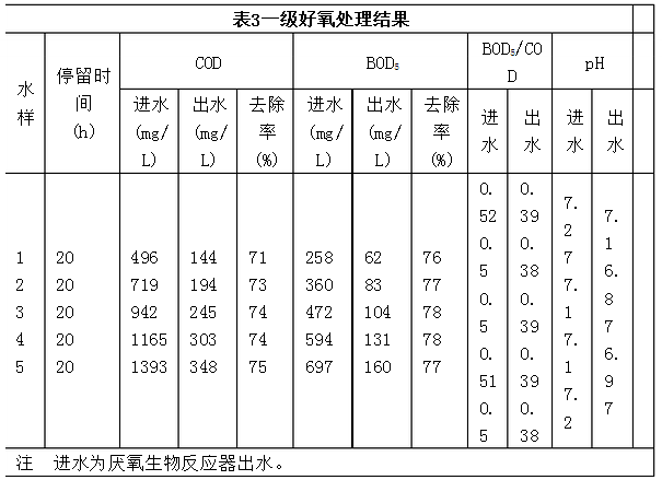 2.2  好氧生物接觸氧化處理 好氧接觸氧化法具有耐沖擊負(fù)荷,無污泥膨脹和維護(hù)方便等優(yōu)點(diǎn)。采用一級(jí)好氧生物接觸氧化處理,出水中的COD仍然達(dá)不到排放標(biāo)準(zhǔn),后又增加了一級(jí)好氧生物接觸氧化處理(有效容積20 L)。試驗(yàn)結(jié)果見表3和表4。