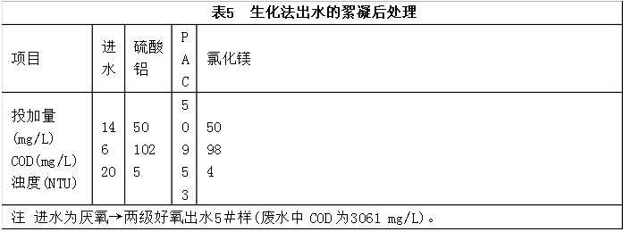 含季銨鹽廢水中COD為2 000~3 000 mg/L,經(jīng)過厭氧→兩級(jí)好氧生物接觸氧化處理后,出水COD>100 mg/L,且略有余濁,故進(jìn)行絮凝后處理。分別采用硫酸鋁、聚合鋁(PAC)和氯化鎂為絮凝劑,石灰為助凝劑,試驗(yàn)結(jié)果見表5。