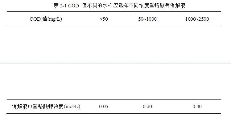 測定地表水、工業廢水(包括高鹽廢水)、生活污水的化學需氧量。根據水樣化學需氧量值得的不同,在消解時應選擇不同濃度的重鉻酸鉀消解液進行消解。參考表2-1選擇消解液。