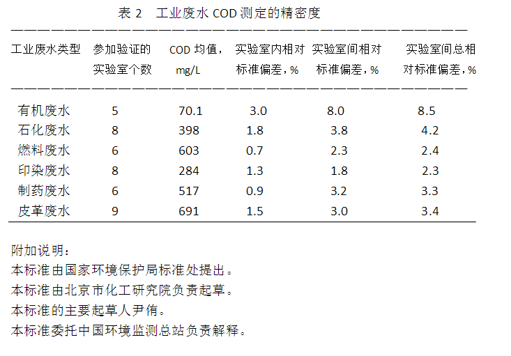 40個(gè)不同的實(shí)驗(yàn)室測(cè)定COD值為500mg/L的鄰苯二甲酸氫鉀(4.7)標(biāo)準(zhǔn)溶液,其標(biāo)準(zhǔn)為20mg/L,相對(duì)標(biāo)準(zhǔn)偏差為4.0%。 8.2.2 工業(yè)廢水測(cè)定的精密度(見表2)。