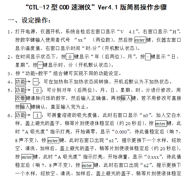 在強(qiáng)酸性溶液中,加入一定量的重鉻酸鉀作氧化劑,在專(zhuān)用復(fù)合催化劑存在下,于165℃恒溫加熱消化水樣10min,重鉻酸鉀被水中還原性物質(zhì)(主要是有機(jī)物)還原為三價(jià)鉻,在波長(zhǎng)610nm處,測(cè)定三價(jià)鉻含量,換算成消耗氧的質(zhì)量濃度。 1.2 儀器 1.2.1   COD快速測(cè)定儀(TL-1A) 1.2.2   分光光度計(jì)(721) 1.2.3   水浴塑料盆 1.2.4   14ml專(zhuān)用刻度試管及試管架(若干) 1.2.5   1.00ml專(zhuān)用刻度吸管(2只) 1.2.6   5.00ml專(zhuān)用刻度吸管(2只) 1.2.7 吸耳球 1.3 試劑 1.3.1 專(zhuān)用氧化劑 1.3.2 專(zhuān)用催化劑 1.3.3 氯掩蔽劑:稱(chēng)取20g硫酸汞溶于1:10稀硫酸中,定容**100ml,