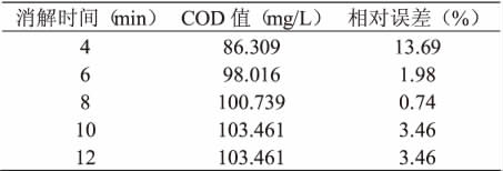 值為 100mg /L) ,在 165℃ 的消解溫度下分別消解不同時間,測定鄰苯二甲酸氫鉀標準溶液的 COD 值,結果如表 2 所示。