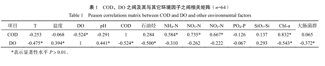 海水中 DO 的主要來(lái)源是大氣中氧的溶解,其次來(lái)自于海洋生物,尤其是浮游植物光合作用時(shí)所放出的氧。表 1 中,DO 值主要與溫度、pH、COD、石油烴、Chl-a、大腸菌群、鹽度等指標(biāo)顯著相關(guān),相關(guān)系數(shù)分別為-0.475、0.441、-0.524、-0.5、-0.543、-0.372、0.394。DO 與溫度明顯負(fù)相關(guān), 符合水體中溶解氧與溫度分布呈反比例的一般規(guī)律(見(jiàn)表 1) 。DO 與 pH 顯著正相關(guān),則反映了有機(jī)污染物氧化分解,消耗氧氣,并導(dǎo)致 pH 值下降的過(guò)程。DO 與石油烴明顯負(fù)相關(guān),可能與石油烴降解耗氧及石油烴污染易在水面形成油膜,影響水-氣界面氧氣交換的作用有關(guān)。盡管亞熱帶河口海區(qū)由于受溫度、光照、及高營(yíng)養(yǎng)鹽含量等因素影響,往往具有較高的初級(jí)生產(chǎn)力(高 Chl-a值) ,浮游植物在光合作用中釋放出大量氧氣,但營(yíng)養(yǎng)鹽水平較高的海區(qū),其耗氧污染物負(fù)荷也較高,污染物降解耗氧速度遠(yuǎn)大于生物作用生成氧氣的速度, 這也是 DO 與 Chl-a 呈現(xiàn)負(fù)相關(guān)的主要原因。大腸菌群指標(biāo)常用來(lái)表征微生物降解有機(jī)物能力,有機(jī)污染程度越高,大腸菌群則越高,這也解釋了 DO 與大腸菌群顯著負(fù)相關(guān)的主要原因 [21] 。DO 與鹽度顯著正相關(guān),主要為鹽度越高,則越靠近外海,其污染負(fù)荷越小,而 DO 含量則越高。